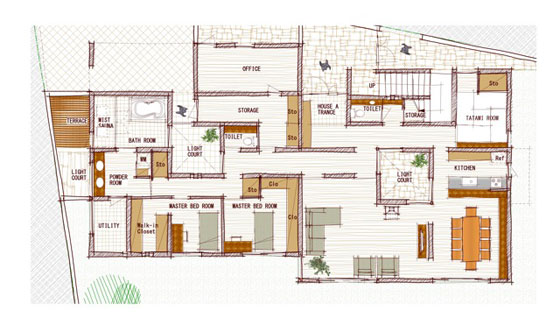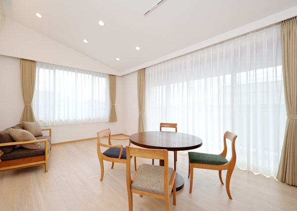 今回は、2階に子世帯が2軒並ぶという配置から、このフロアのプライバシーには特に気をつけました。寝室同士を極力遠ざけること、2軒の境となる壁の厚みは遮音効果を考慮して標準以上の厚みとなるように設計するなど、日常のストレスを生じない工夫を随所に盛り込んでいます。