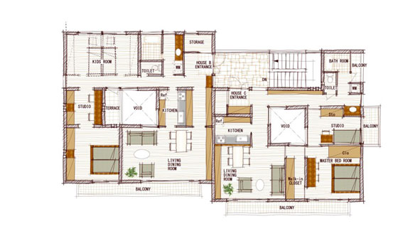 敷地の中にどのような形の建物をどこに建てるか?というテーマひとつをとっても、住む人には大きな影響を与えます。このケースでは、各世帯からの庭が自分の家専用の庭に見えるよう工夫して建物を配置し、部屋ごとの窓の位置を計画しました。庭も広がりを感じられるようレイアウトを検討し、スケール感を更に引き出すように外構デザインを施しています。2階の各住戸バルコニーは隣の世帯から見えないように、位置と目線を制御しています。