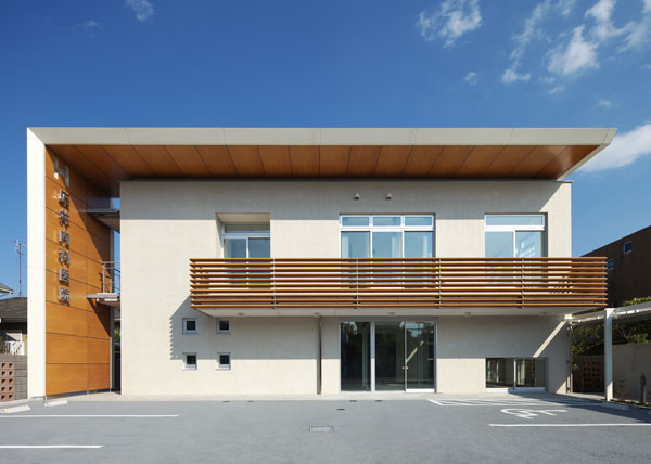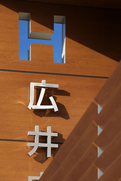 建物の外観は、交通量の多い前面道路から目に留まりやすいよう大きく大胆な庇とレンガタイルの外壁を特徴としています。直線を主体としたシンプルで力強い意匠は、秩序と信頼の感覚を与え、ざらっとした風合いのレンガタイルが太陽光を受け時々刻々と色味が変化することにより清潔感と温かみの感覚を与えることを意図しています。