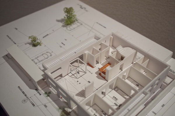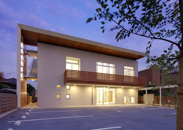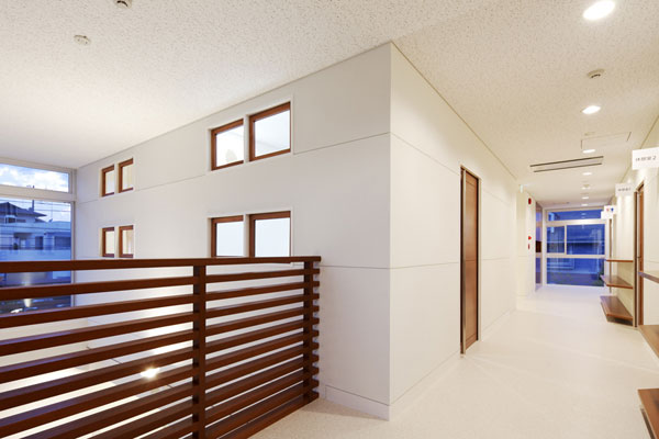 院長室はエントランスから医院全体を通り抜け2階へ上った一番奥に位置しています。院長室前の廊下からは下部の吹き抜け越しに待合の様子を見ることができます。正面に広がる大きな窓からは旧医院の建物を初め周囲の家々を望むことができます。地域医療に貢献し続けてきた広井内科医院が、地域全体へのまなざしを持ち続けていることを表現しています。