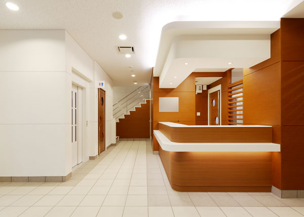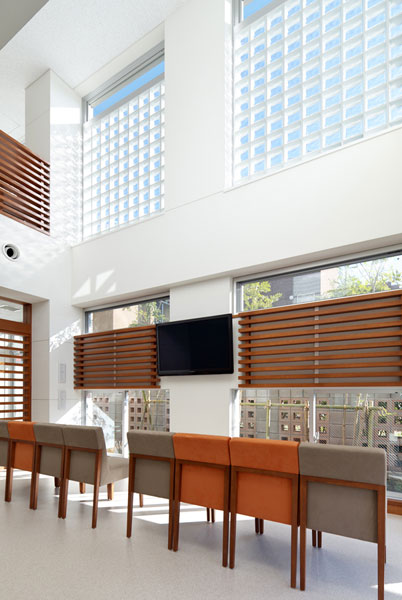 特に待合室は、空間の印象を大きく左右する椅子に高い清掃性とスエード調の本物の質感を両立させた生地を選び、色の組み合わせとともに明るく華やいだ雰囲気となるようにしています。上部の吹き抜けからは、自然光が降り注ぎ、淡い白色の塗り壁を明るく照らしながら来訪者を優しく包み込むように計画しています。ここでも塗り壁の白さは、光の当たり方で微妙に表情を変えながらしっとりとした落ち着きをもたらしています。